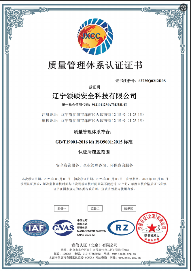 遼寧領碩安全科技有限公司位于遼寧省沈陽市渾南區天壇南街12-15號,注冊資金300萬。主要經營范圍為遼寧省范圍內的安全環保咨詢,生產安全事故應急預案技術服務、企業雙重預防機制建立、履職能力評估、企業科研項目安全部分服務等的技術服務機構。現有員工12人,其中包括5名遼寧省級安全生產專家。成立于2022年4月18日,在盤錦市成立至今已經為30余家企業提供了安全環保技術咨詢。 業務范圍包括:技術服務、技術開發、技術咨詢、技術交流、技術轉讓、技術推廣,安全咨詢服務,環保咨詢服務,標準化服務,企業管理咨詢,科技中介服務,工程管理服務,特種作業...查看更多